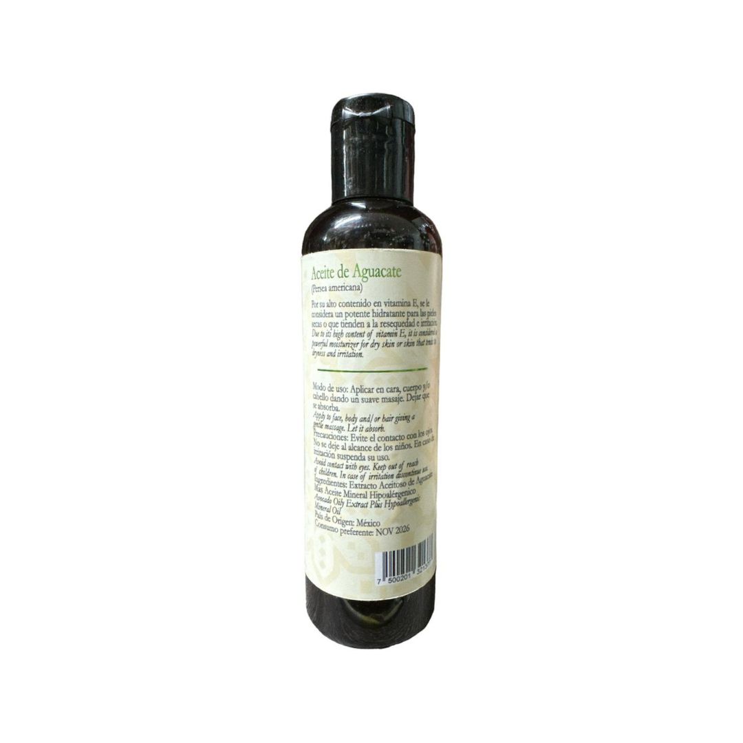 El aceite de aguacate disminuye inflamación e irritación en la piel, humecta, suaviza y nutre la piel y el cabello, aclara las manchas oscuras, y estimula la producción de colágeno.